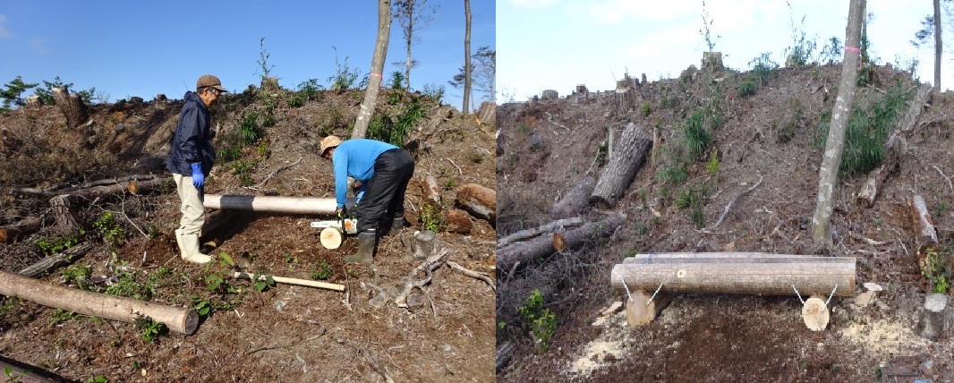 丸太ベンチは伐採した木の中から檜の皮を剥ぎ3基を製作し設置しました。